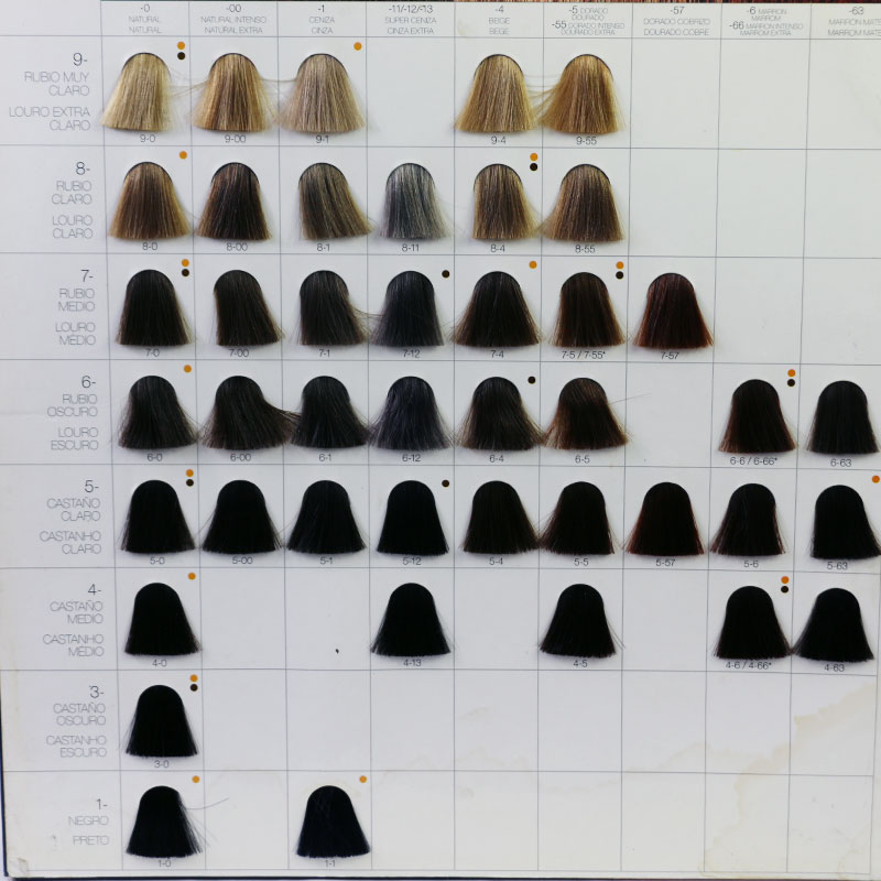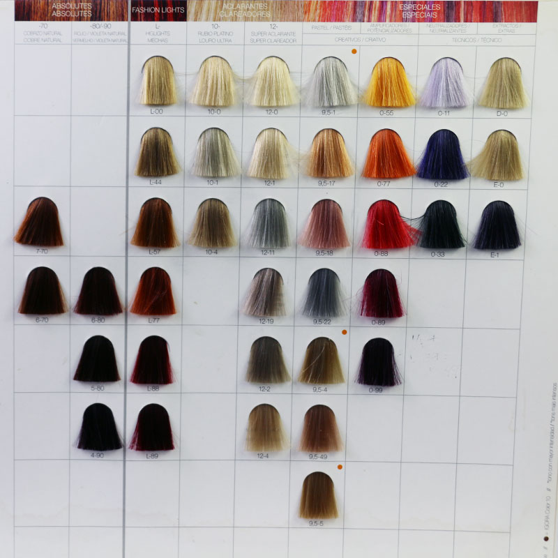 0-11 Tono mezcla argenta, 0-22 Tono mezcla azul, 0-33 Tono mezcla verde, 0-55 Tono mezla dorado, 0-77 Tono mezcla cobrizo, 0-88 Tono mezcla rojo, 0-89 Tono mezcla rojo violeta, 0-99 Tono mezcla violeta, 1-0 Negro, 1-1 Negro azul, 10-0 Rubio platino, 10-1 Rubio platino cenizo, 10-4 Rubio platino beige, 12-0 Superaclarador natural, 12-1 Superaclarante cenizo, 12-11 Superaclarante cenizo profundo, 12-19 Superaclarante cenizo violeta, 12-2 Superaclarante humo, 12-4 Superaclarante beige, 3-0 Castaño oscuro, 3-65 Castaño oscuro marrón dorado, 3-68 Castaño oscuro marrón rojo, 4-0 Castaño medio, 4-13 Castaño medio cenizo mate, 4-5 Castaño medio dorado, 4-6/4-66 Castaño medio marrón intenso, 4-60 Castaño medio marrón natural, 4-63 Castaño medio marrón mate, 4-65 Castaño medio marrón dorado, 4-68 Castaño medio marrón rojo, 4-88 Castaño medio rojo intenso, 4-90 Castaño medio violeta natural, 4-99 Castaño medio violeta intenso, 5-0 Castaño claro, 5-00 Castaño claro intenso, 5-1 Castaño claro cenizo, 5-12 Castaño claro cenizo humo, 5-4 Castaño claro beige, 5-5 Castaño claro dorado, 5-50 Castaño claro dorado natural, 5-57 Castaño claro dorado cenizo, 5-6 Castaño claro marrón, 5-60 Castaño claro marrón natural, 5-63 Castaño claro marrón mate, 5-65 Castaño claro marrón dorado, 5-68 Castaño claro marrón rojo, 5-7 Castaño claro cobrizo, 5-80 Rojo natural castaño claro, 5-88 Castaño claro rojo intenso, 5-99 Castaño claro violeta intenso, 6-0 Rubio oscuro, 6-00 Rubio oscuro intenso, 6-1 Rubio oscuro cenizo, 6-12 Rubio oscuro cenizo humo, 6-4 Rubio oscuro beige, 6-5 Rubio oscuro dorado, 6-6/6-66 Rubio oscuro marrón intenso, 6-60 Rubio oscuro marrón natural, 6-63 Rubio oscuro marrón mate, 6-65 Rubio oscuro marrón dorado, 6-68 Rubio oscuro marrón rojo, 6-70 Rubio oscuro cobrizo natural, 6-77 Rubio oscuro cobrizo intenso, 6-80 Rubio oscuro rojo natural, 6-88 Rubio oscuro rojo intenso, 6-89 Rubio oscuro rojo violeta, 6-99 Rubio oscuro violeta intenso, 7-0 Rubio medio natural, 7-00 Rubio medio intenso, 7-1 Rubio medio cenizo, 7-12 Rubio medio cenizo humo, 7-4 Rubio medio beige, 7-5/7-55 Rubio medio dorado intenso, 7-50 Rubio medio dorado natural, 7-57 Rubio medio dorado cobrizo, 7-60 Rubio medio marrón natural, 7-65 Rubio medio marrón dorado, 7-70 Rubio medio cobrizo natural, 7-77 Rubio medio cobrizo intenso, 8-0 Rubio claro natural, 8-00 Rubio claro intenso, 8-1 Rubio claro cenizo, 8-11 Rubio claro cenizo intenso, 8-4 Rubio claro beige, 8-50 Rubio claro dorado natural, 8-55 Rubio claro dorado intenso, 8-65 Rubio claro marrón dorado, 8-77 Rubio claro cobrizo intenso, 9-0 Rubio muy claro natural, 9-00 Rubio muy claro natural intenso, 9-1 Rubio my claro cenizo, 9-4 Rubio muy claro beige, 9-40 Rubio muy claro beige natural, 9-50 Rubio muy claro dorado natural, 9-55 Rubio muy claro dorado intenso, 9-60 Rubio muy claro marrón natural, 9-65 Rubio muy claro marrón dorado, 9-7 Rubio muy claro cobrizo, 9-88 Rubio muy claro rojo intenso, 9-98 Rubio muy claro violeta rojo, 9,5-1 Perla pérola, 9,5-17 Melocotón pessego, 9,5-18 Rosa, 9,5-22 Azul claro, 9,5-4 Beige, 9,5-49 beige frio, 9,5-5 Dorado, D-0 Natural tono mezcla, E-0 Especial aclarador, E-1 extracto cenizo extra cenizo, L-00 Rubio natural natural, L-44 Bege, L-57 Dorado cobrizo, L-77 Cobrizo cobre, L-88 Rojo Vermelho, L-89 Rojo violeta vermelho violeta, 10-21 Rubio platino humo ceniza, 4-50 Castaño Medio Dorado Natural, 4-70 Castaño Medio Cobrizo Natural, 6-50 Rubio oscuro dorado, 8-46 rubio claro beige marrón, 8-60 Rubio Claro Chocolate Natural, 9,5-29 Lavanda pastel, Absolute 6-460, Absolute 7-450, Absolute 7-560, Absolute 7-710, Absolute 8-140, Absolute 9-140, Dove Gray, L-33, P11-89 Rubio Ultra Coral, Silver, Slate Grey
